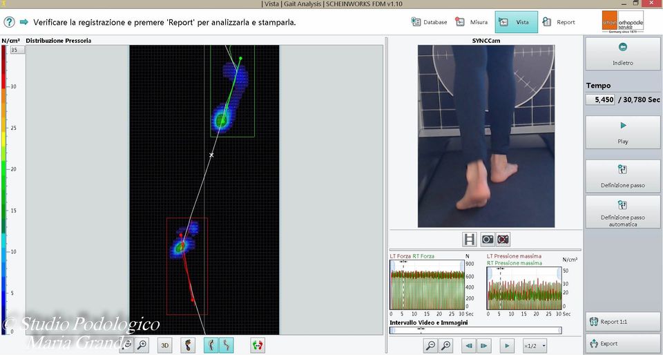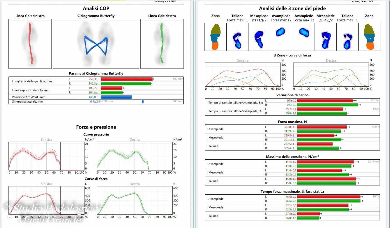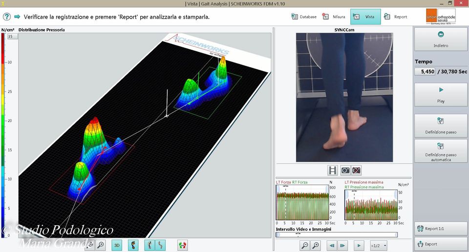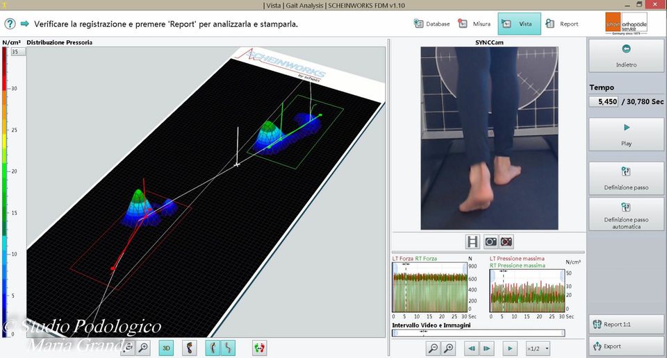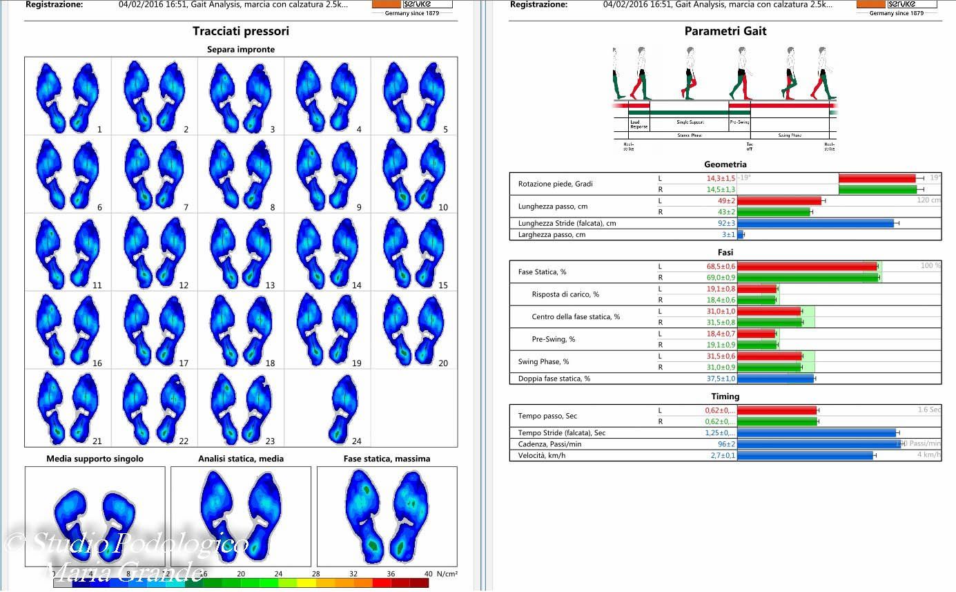 Report dell'analisi dinamica (marcia) con la calzatura e ortesi plantari su misura