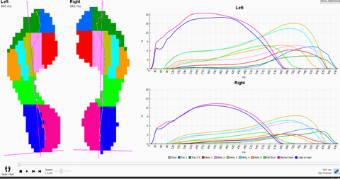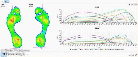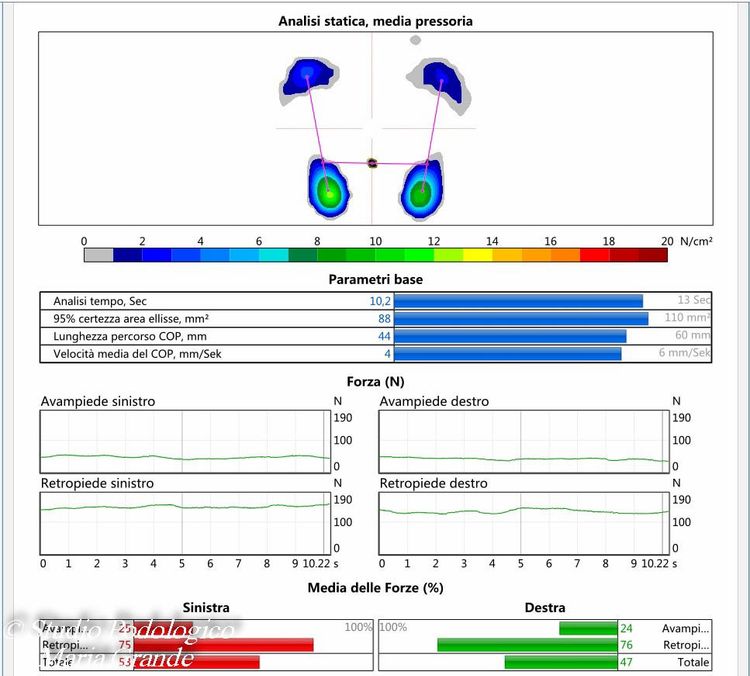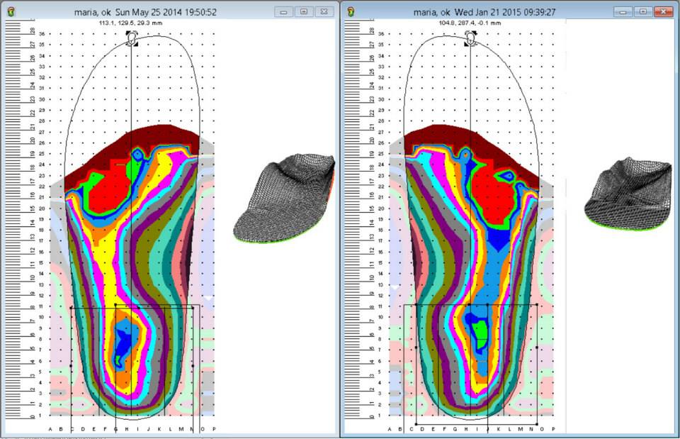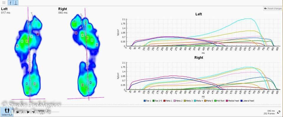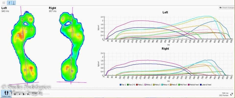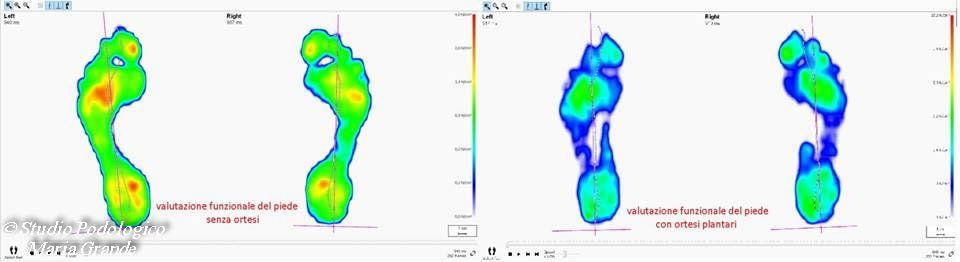 La valutazione baropodometrica e il confronto delle curve di pressione, delle zone e lo studio dell'integrale p/t evidenzia le variazioni indotte dalla terapia ortesica. E' possibile confrontare l'andamento delle curve di appoggio delle teste metatarsali prima e dopo l'ortesizzazione del piede ed osservare che la messa in carico è progressiva.