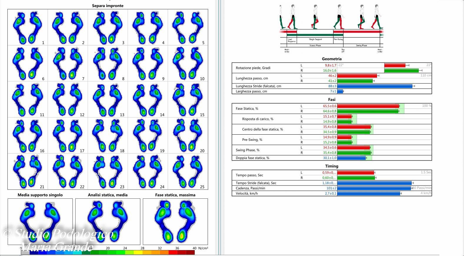 L'analisi statica rappresenta superfici e carichi totali di appoggio di ciascun piede con dettagli dei valori relativi all'avampiede e al retropiede, sovraccarichi metatarsali e digitali.