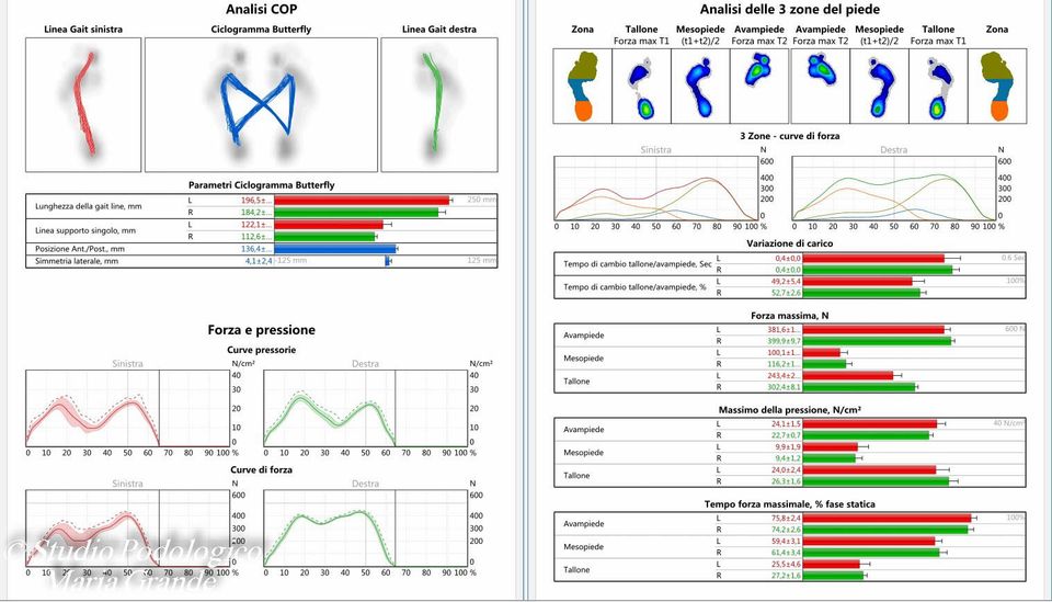 L'analisi dinamica fornisce i valori delle superfici, delle pressioni, velocità e modalità di svolgimento del passo. E' quindi possibile visualizzare il centro di pressione del singolo piede in ogni istante del rotolamento e la relativa risultante del passo